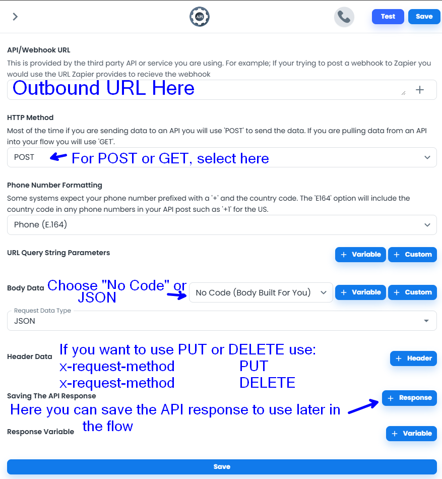 3. Add your API/Webhook URL in the first large box. If needed, make sure you add any public or private keys or tokens to the end of the URL.