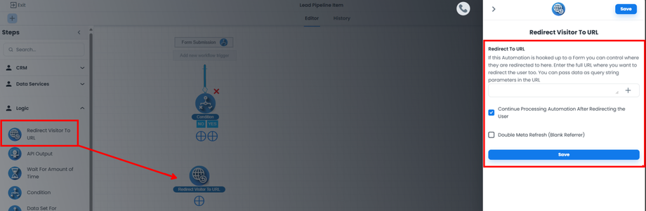 Then add the "Redirect Visitor To URL" flow step, which is in the "Logic" dropdown.