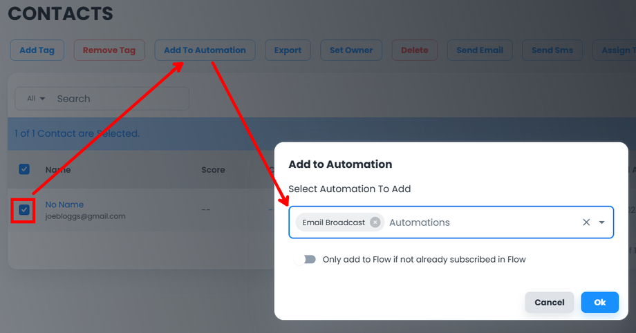Now just go to the Contacts/Database page, select who you want the email broadcast to go to and "Add to Automation".