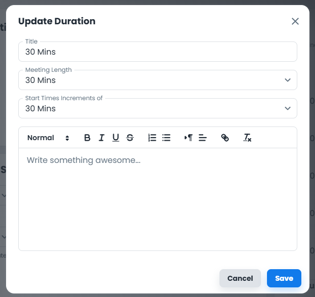 Choose which duration appointments you want to be available. By default, there's 15m, 30m and 60m, but you can edit/delete those and choose your own.
