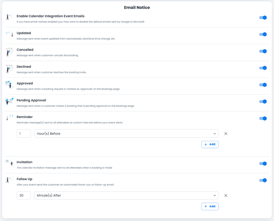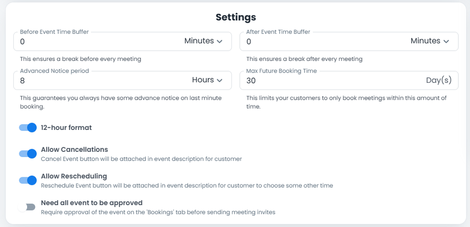 This is all down to personal preference and the values you use are very much up to you, but if you're having 60 minute meetings with 60 minute increments, you probably wouldn't want to add a "before" or "after" buffer, then the "Advanced Notice Period" is very much down to whether you want people to be able to book an appointment on the same day.