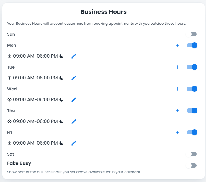 It's pretty self explanatory, but if you want to schedule in breaks throughout the day, you can add additional time windows using the + button on the appropriate day.