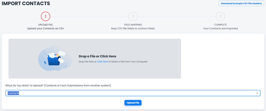 You can either upload "Contacts" with basic data, but if you want to use custom fields, then you will need to create a form with all the information you plan to import, then in the "Import Contacts" screen, you'll be able to select the form from the dropdown, and map the fields.