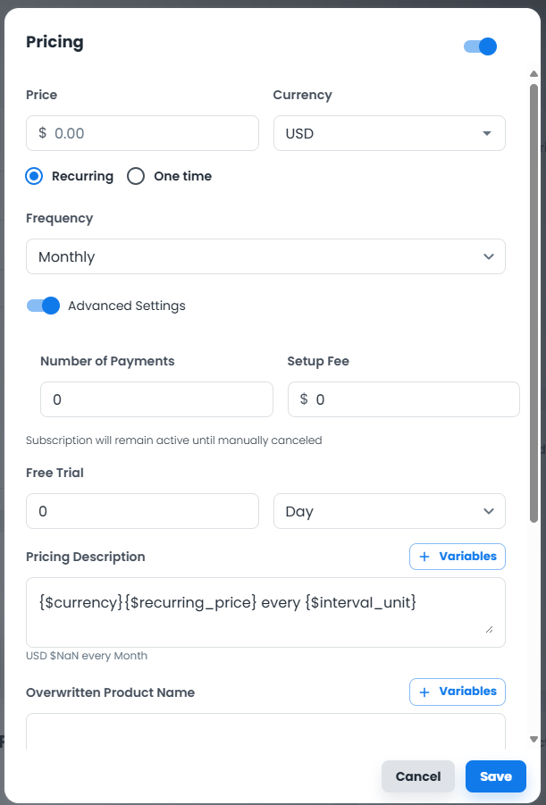 7. Choose your Free Trial period and click Save to save the price, then save the product by hitting "Save" in the top right.