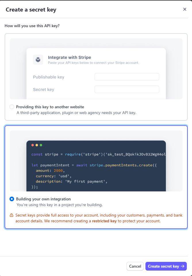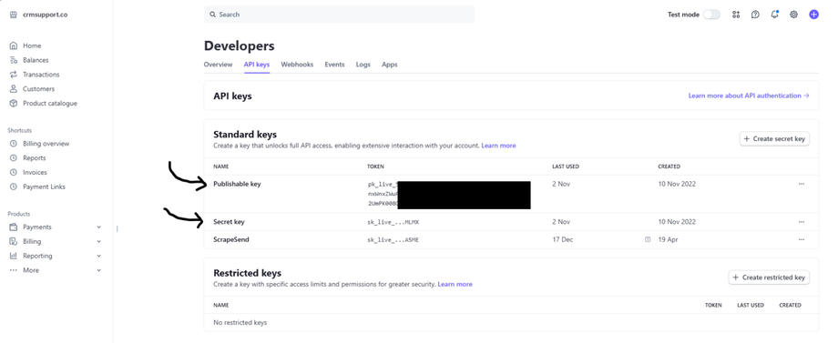 3. On the next screen, you'll see "Publishable" & "Secret" keys.