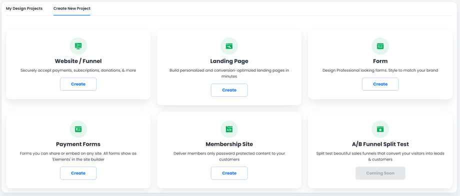 For most people looking to build a landing page, website, funnel etc, you're going to want to click on "Website/Funnel", which will direct you to the site builder.