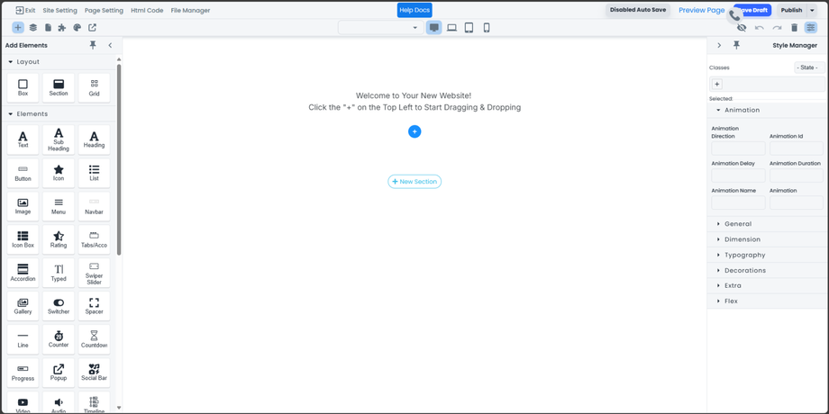 Now you'll want to use the elements from the left sidebar and click and drag them onto the page builder so you can create the design you want.